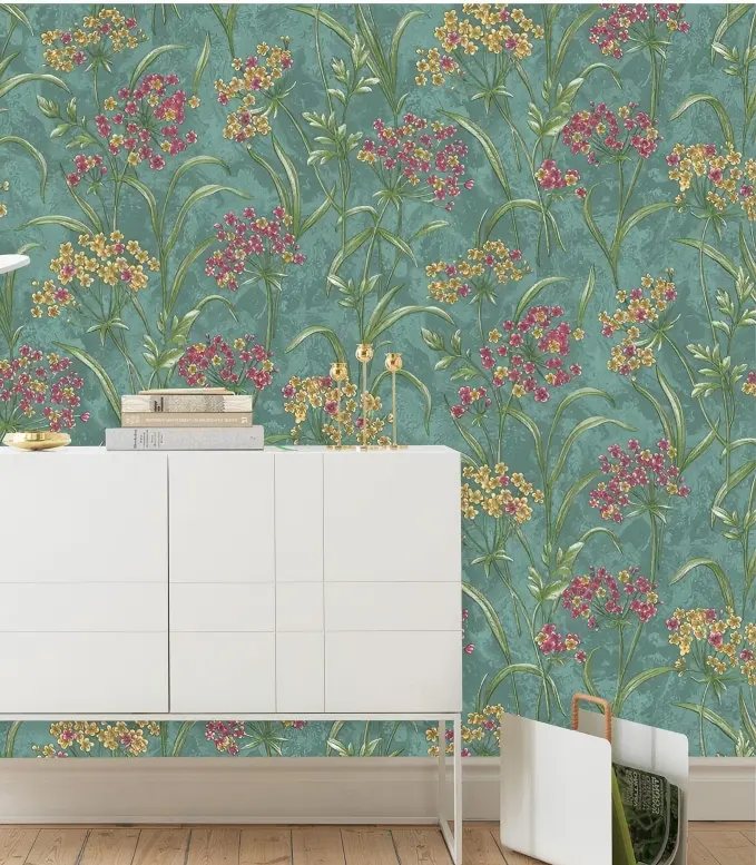 Artistic Teal Wallpaper With Colorful Wildflower Meadow Motif BL1075