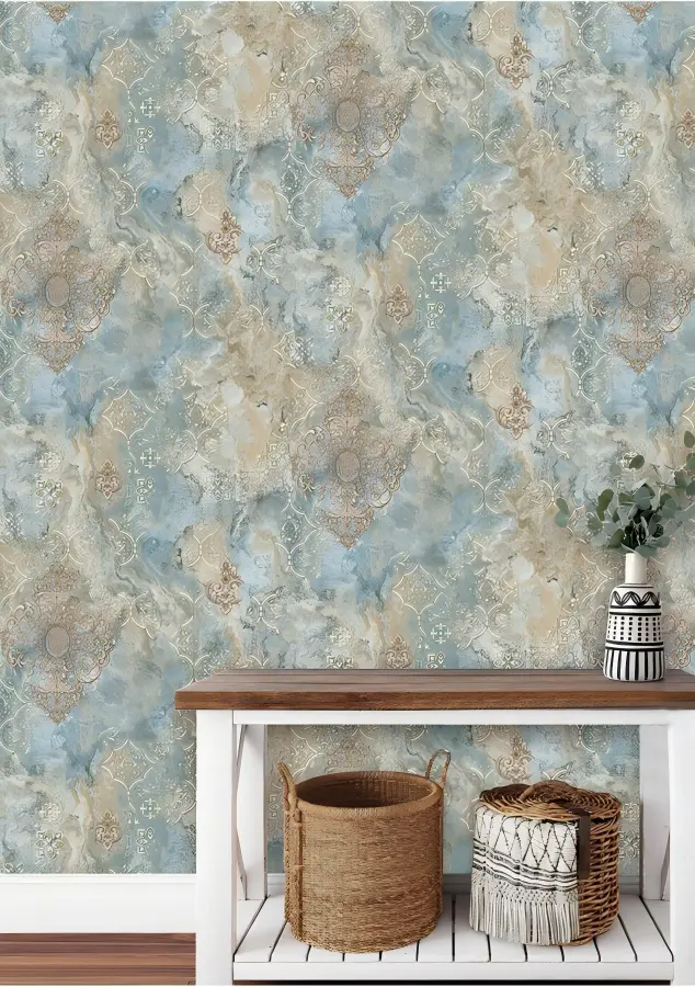 Artisitic Blue Wallpaper With Faded Ornamental Patterns BL1102