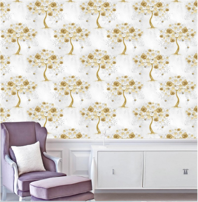 Exquisite Floral Tree Wallpaper With Artfully Designed Floral Tree Patterns 98073 upgrade your space with our premium Shinning Gold Glitter 3D Wallpaper crafted from PVC vinyl to ensure durability and elegance. This wallpaper is ideal for residential and commercial applications, offering an easy-to-install and low-maintenance solution for interior design.