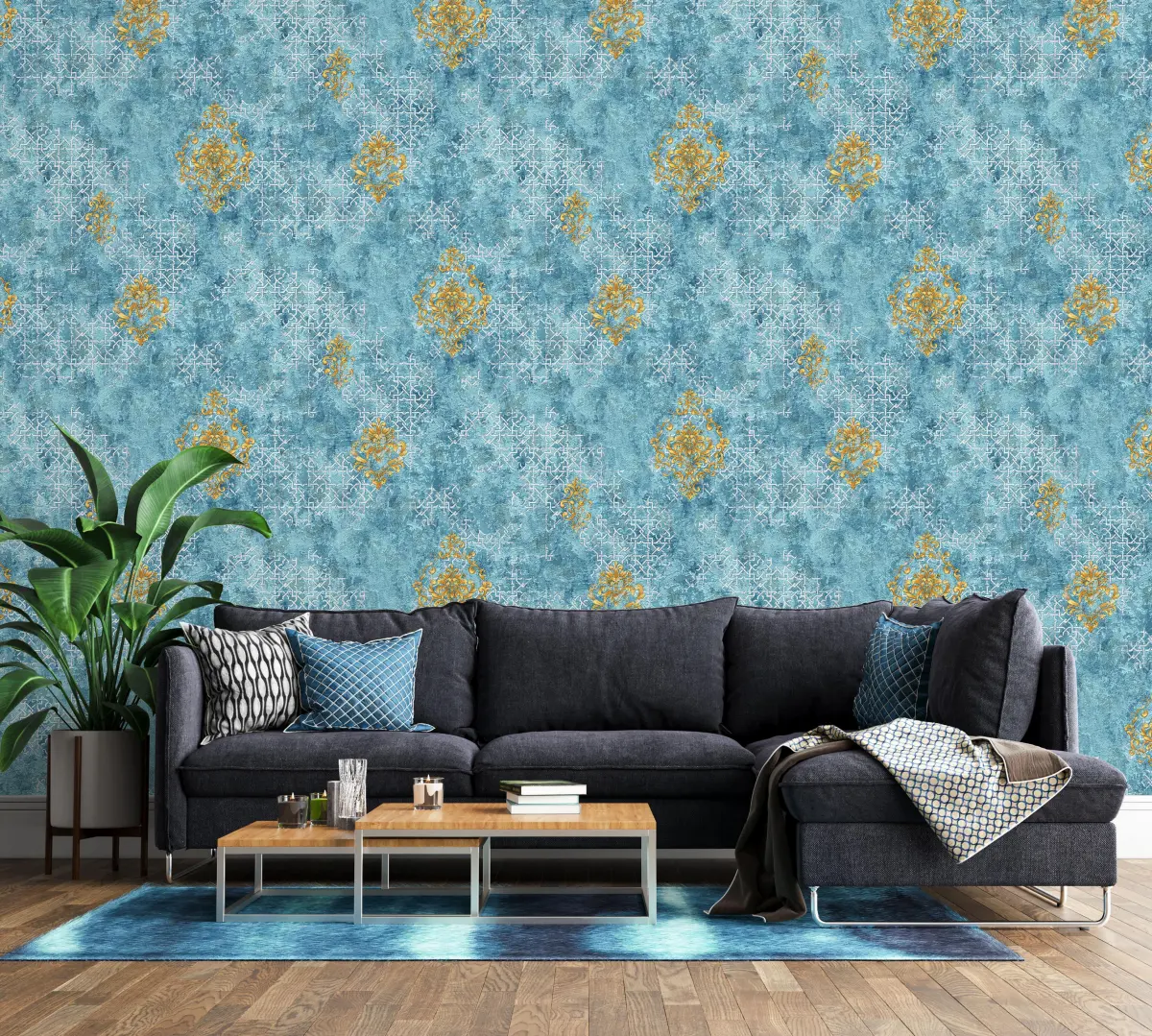 Vinyl Blue Damask Pattern Wallpaper Roll upgrade your space with our premium Shinning Gold Glitter 3D Wallpaper crafted from PVC vinyl to ensure durability and elegance. This wallpaper is ideal for residential and commercial applications, offering an easy-to-install and low-maintenance solution for interior design.